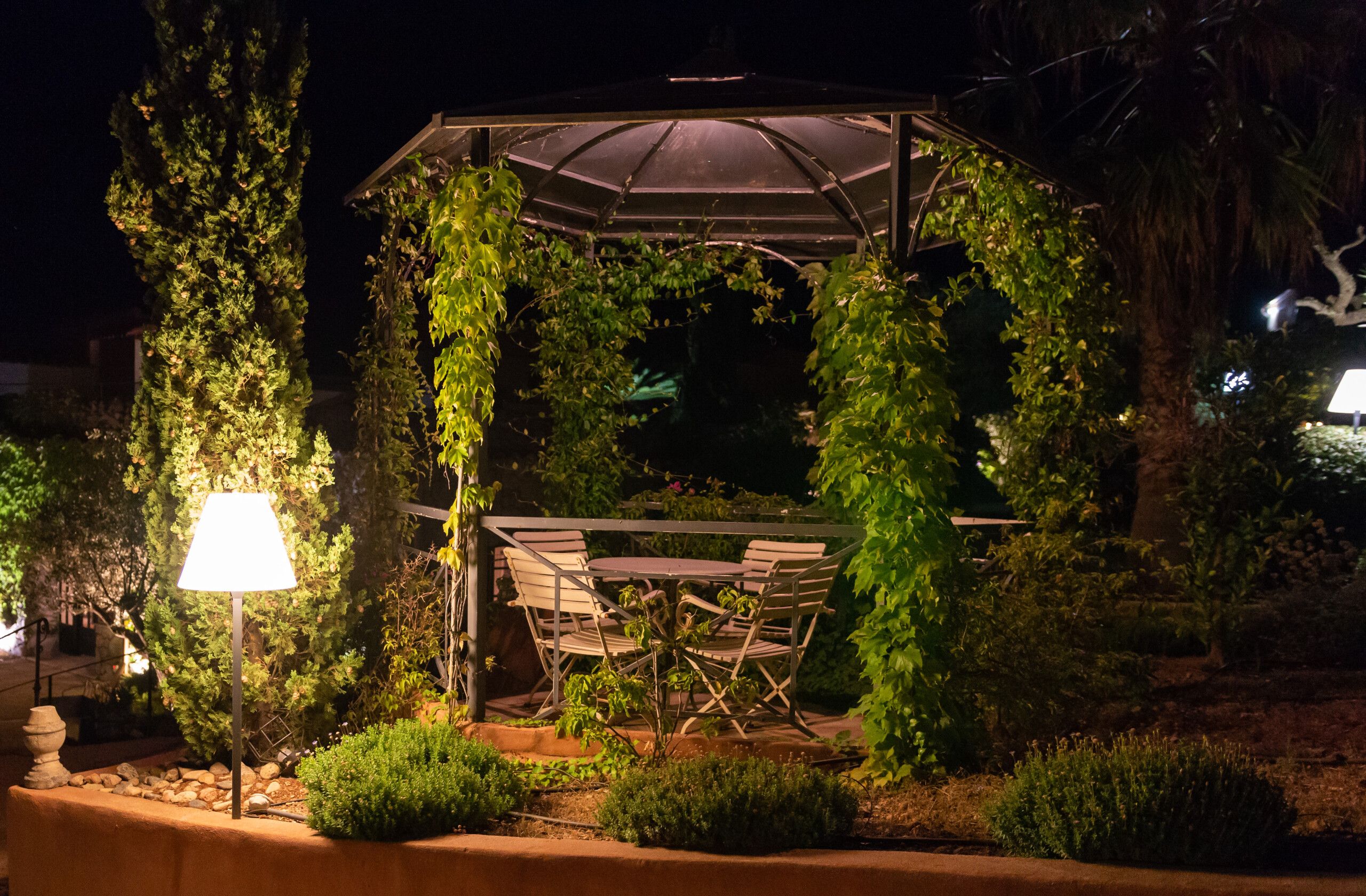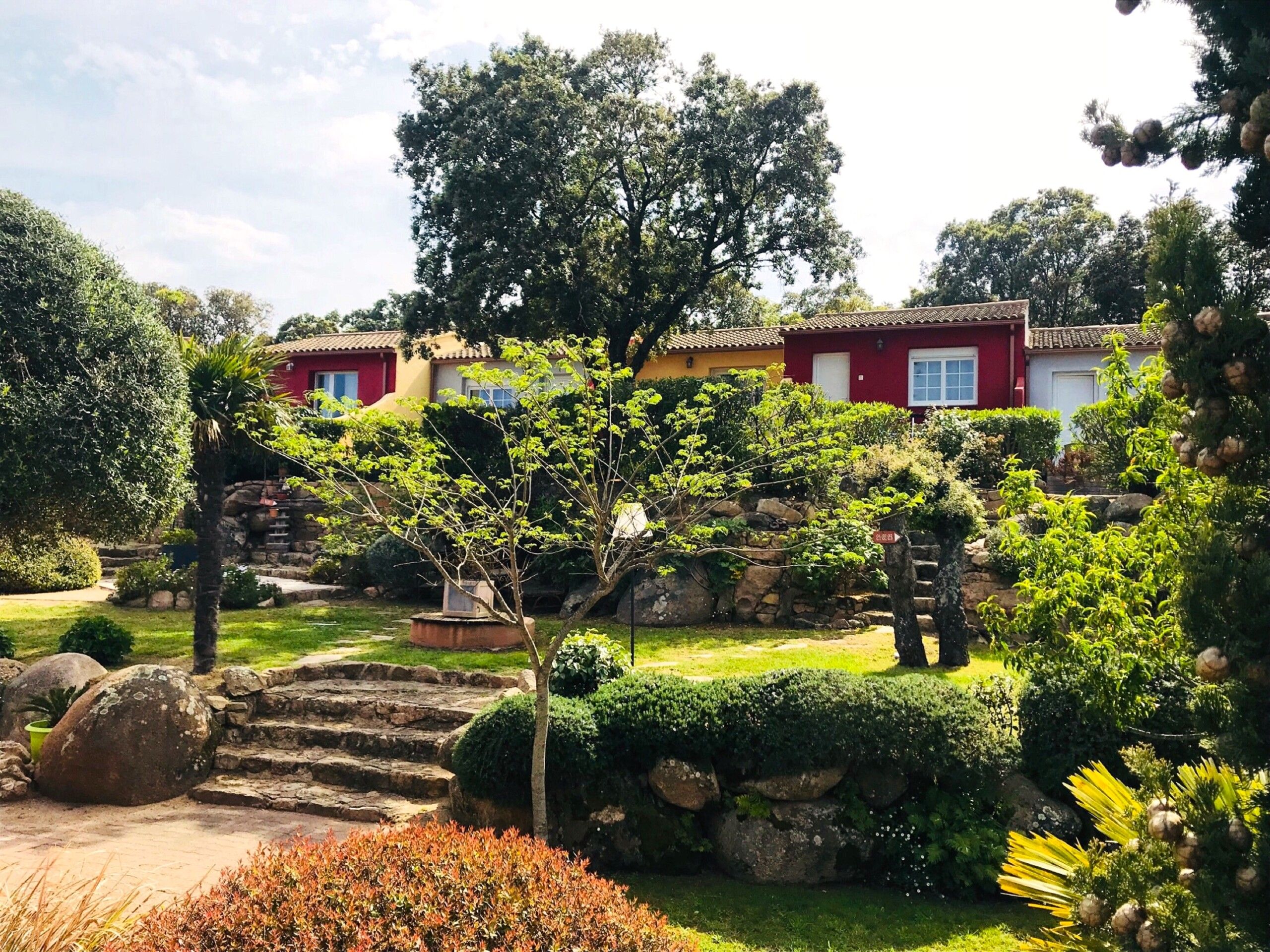 Avec comme seul bruit celui des cascades des jacuzzis, les jardins fleuris sentent bon la lavande, la citronnelle, le romarin. Les bâtiments de pierre et de couleur sont disséminés autour d’escaliers cernés de buissons fleuris. Ce cadre lui confère charme et convivialité.
