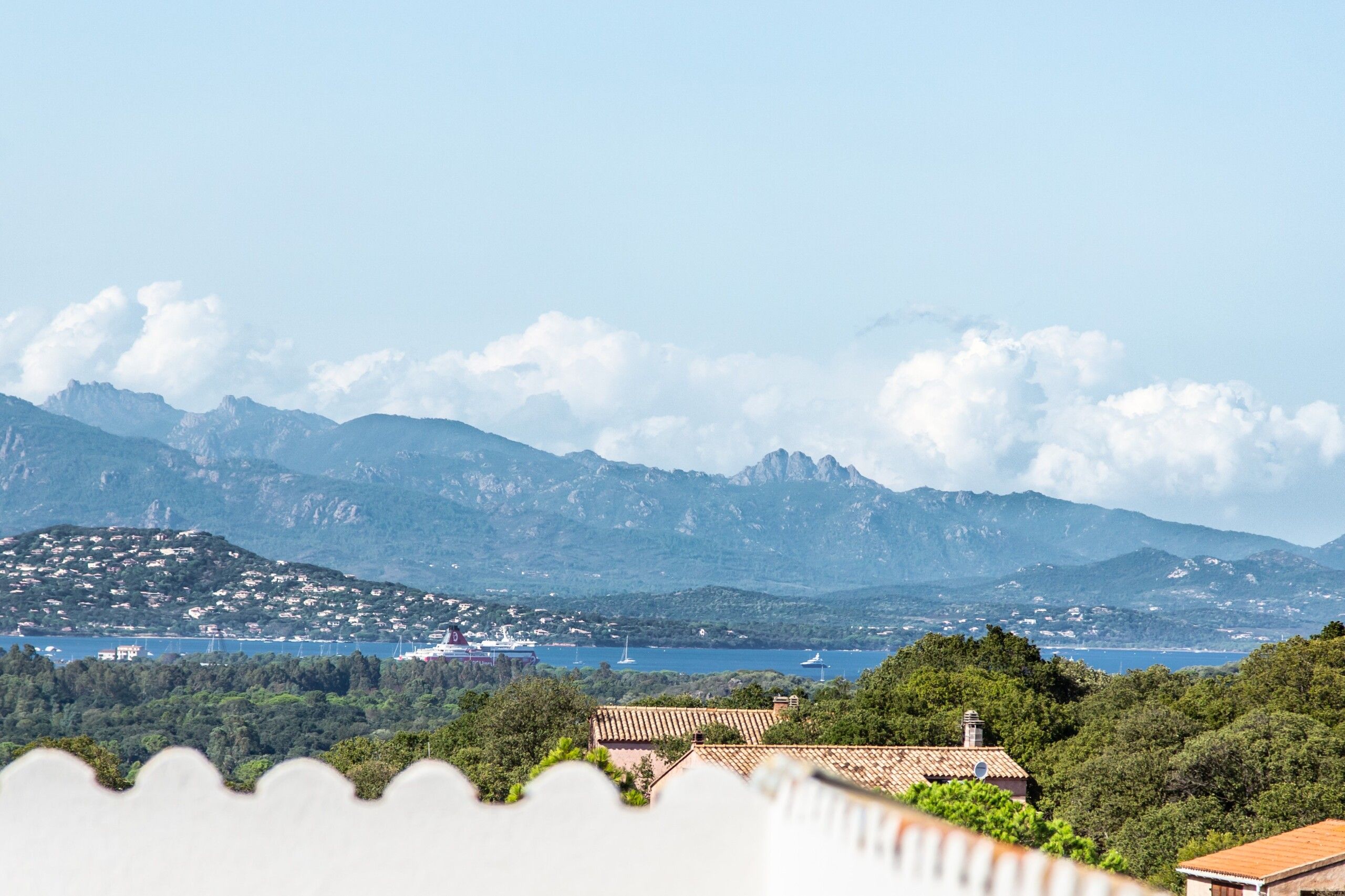 Découvrez la terrasse de la piscine sur laquelle une carte fraîcheur est proposée pour le déjeuner, vue panoramique sur les montagnes environnantes et le golfe de Porto-Vecchio.